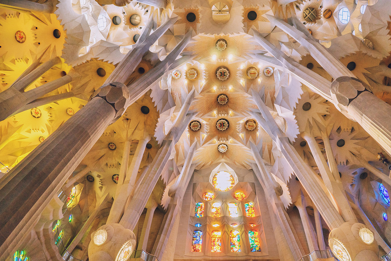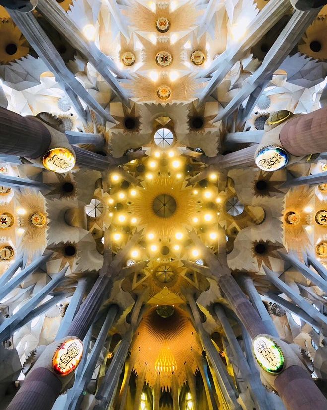 除了令人震撼的高度,富有設(shè)計感的幾何圖案細節(jié),圣家堂內(nèi)部的光影效果,更是增強了圣家族大教堂的感染力與莊嚴(yán)感。