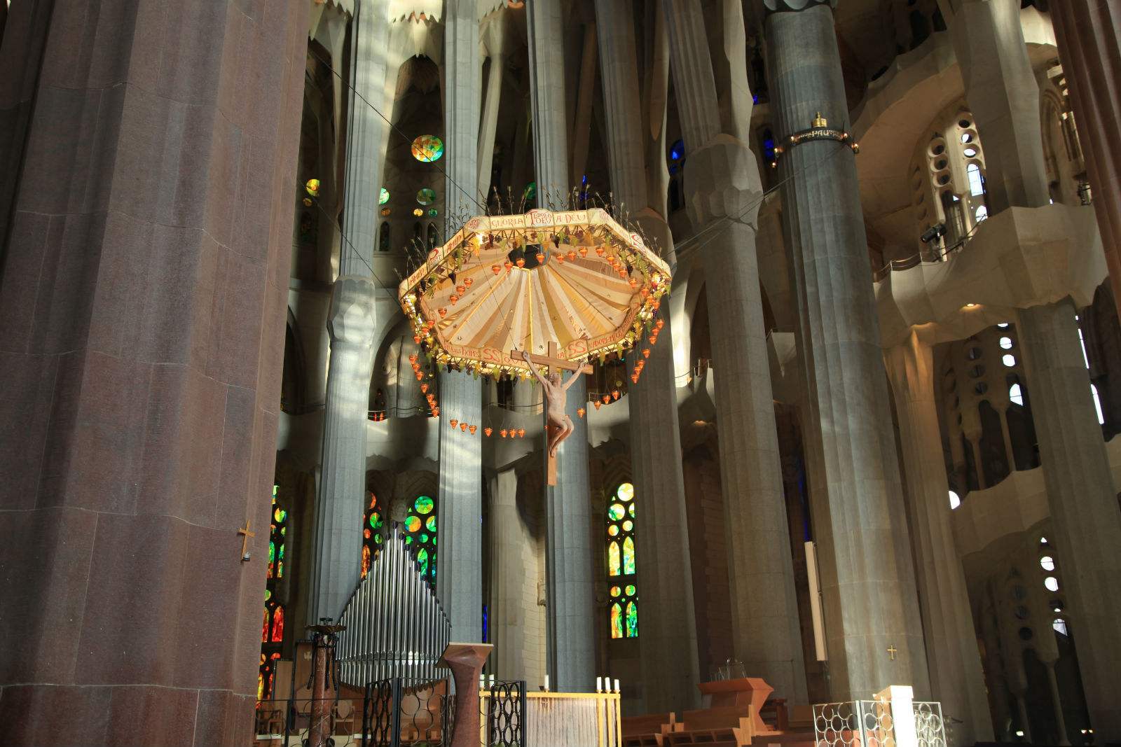 教堂內(nèi)部別有洞天,在這里你更可感覺到圣家族大教堂建筑風(fēng)格的前衛(wèi),這是一個以“自然”為主題元素的大教堂,步入其中仿佛進入了一片茂盛的熱帶雨林。