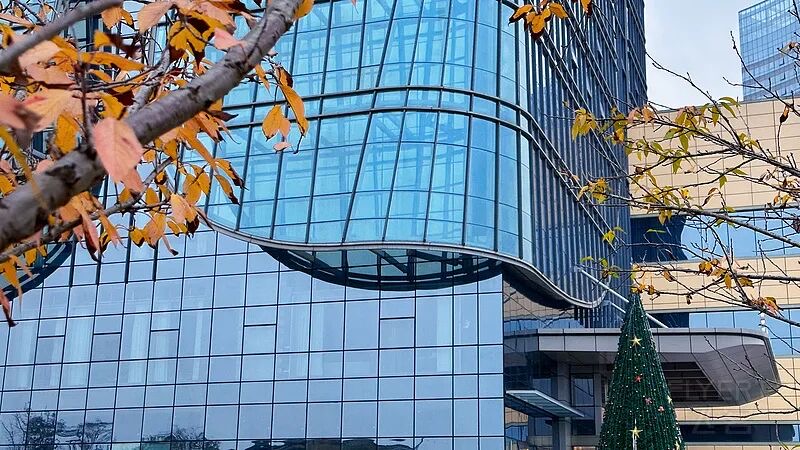 玻璃幕墻如澄澈水面,倒映天光云影,晨霧初散時,樓體仿佛浮于江上;夜幕低垂后,燈火點點,又似星河墜落人間。